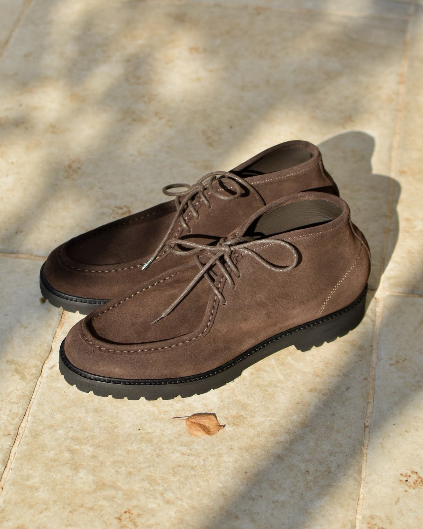 - Tomaia esterna: Vera pelle Italiana scamosciata marrone