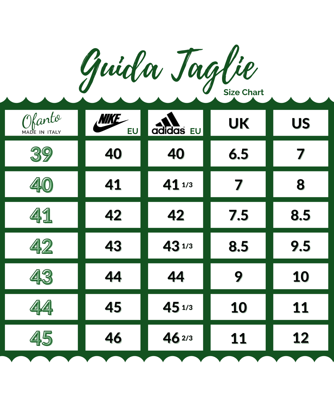 Ogni pagina prodotto include una guida alle taglie. In caso di dubbio, consigliamo di scegliere la taglia più grande.