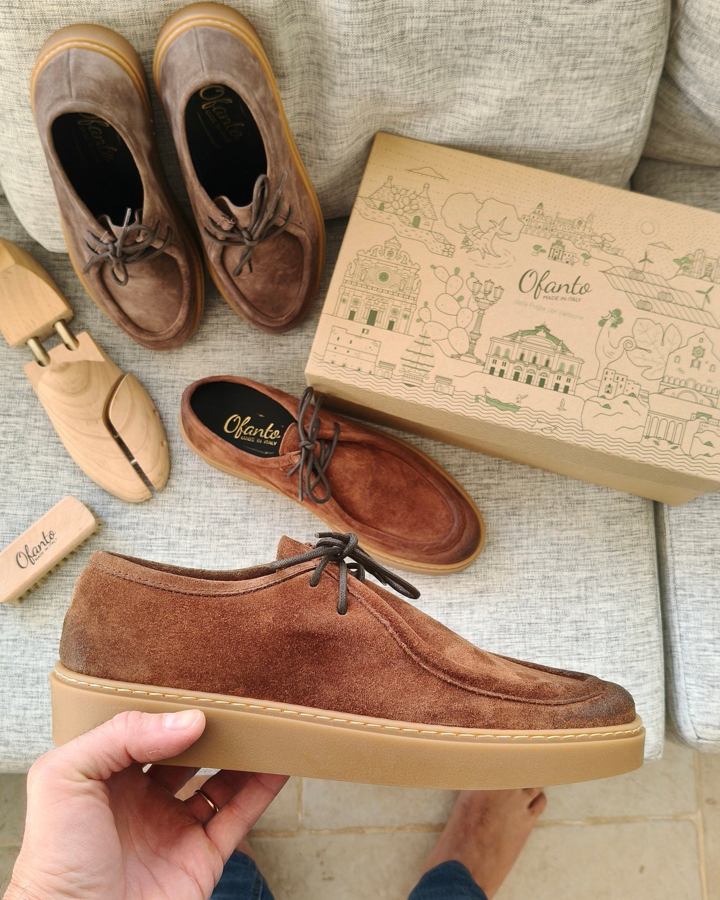 - Tomaia esterna: Vera pelle di vitello italiana martellata