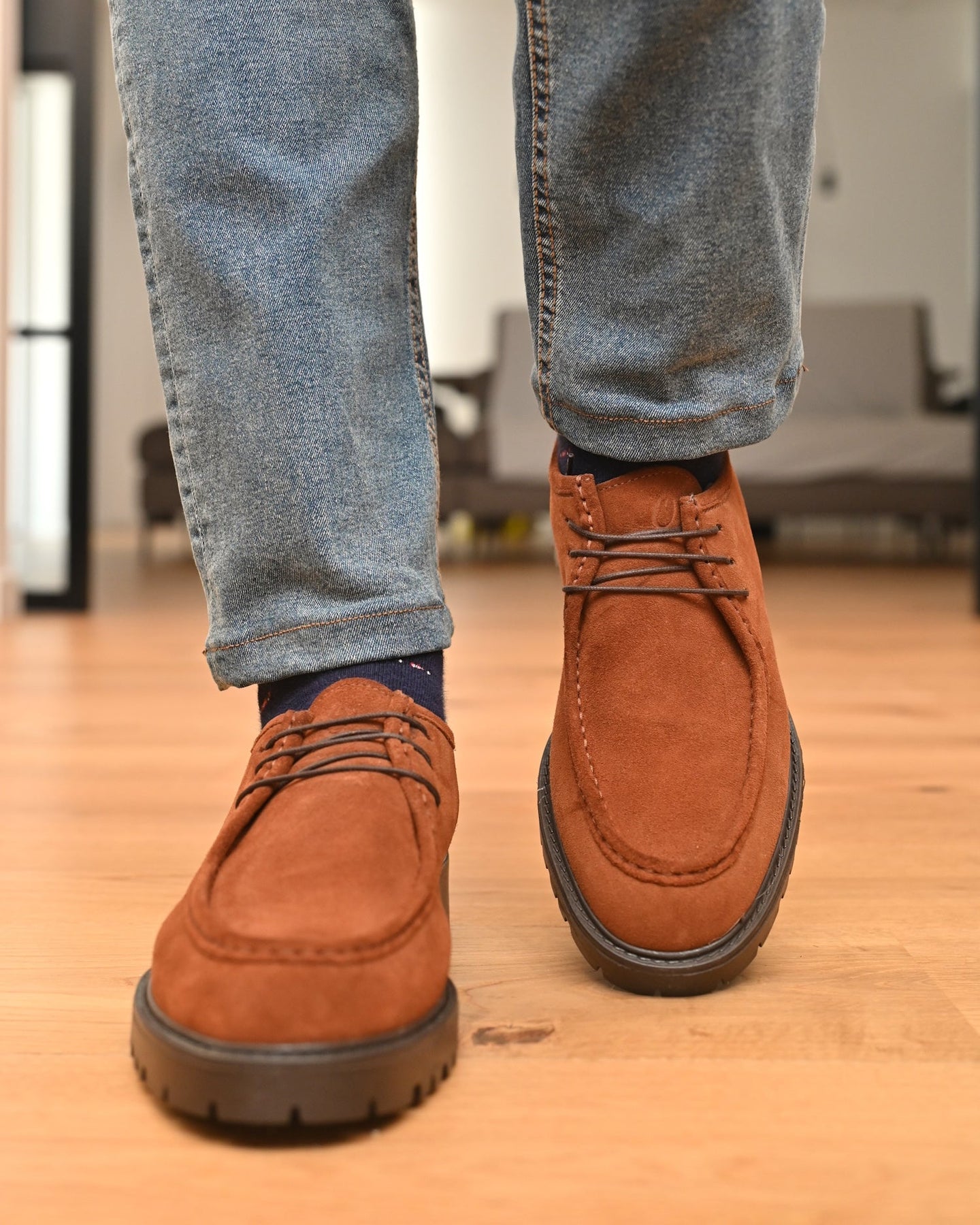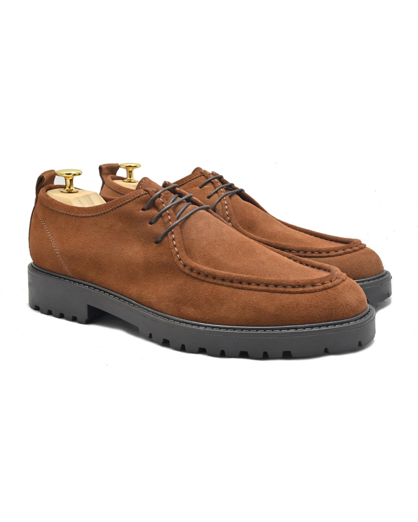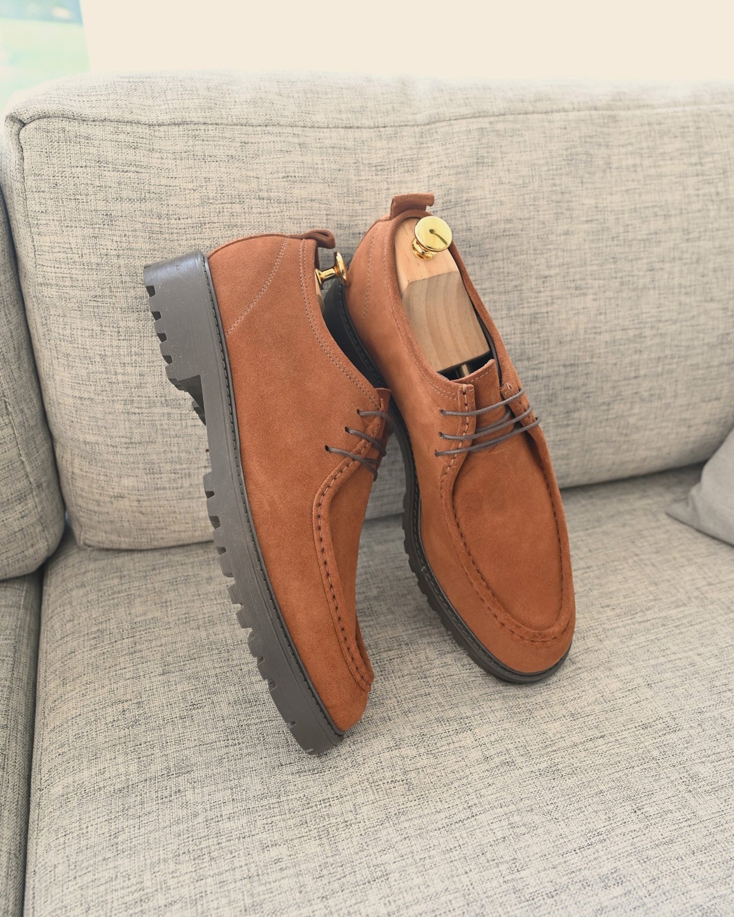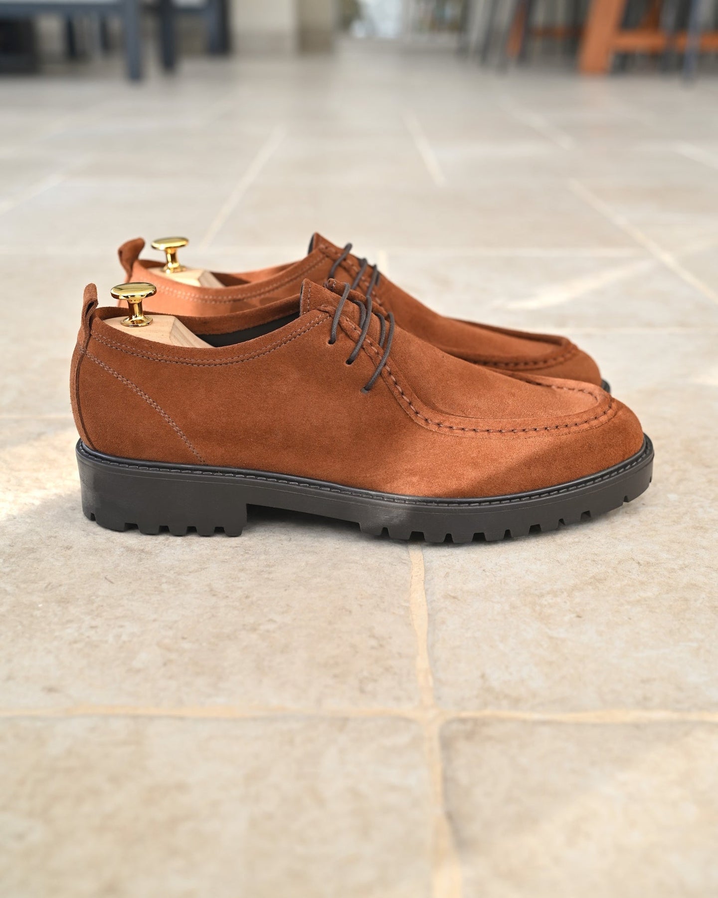 - Tomaia esterna: Vera pelle Italiana Scamosciata color marrone tabacco