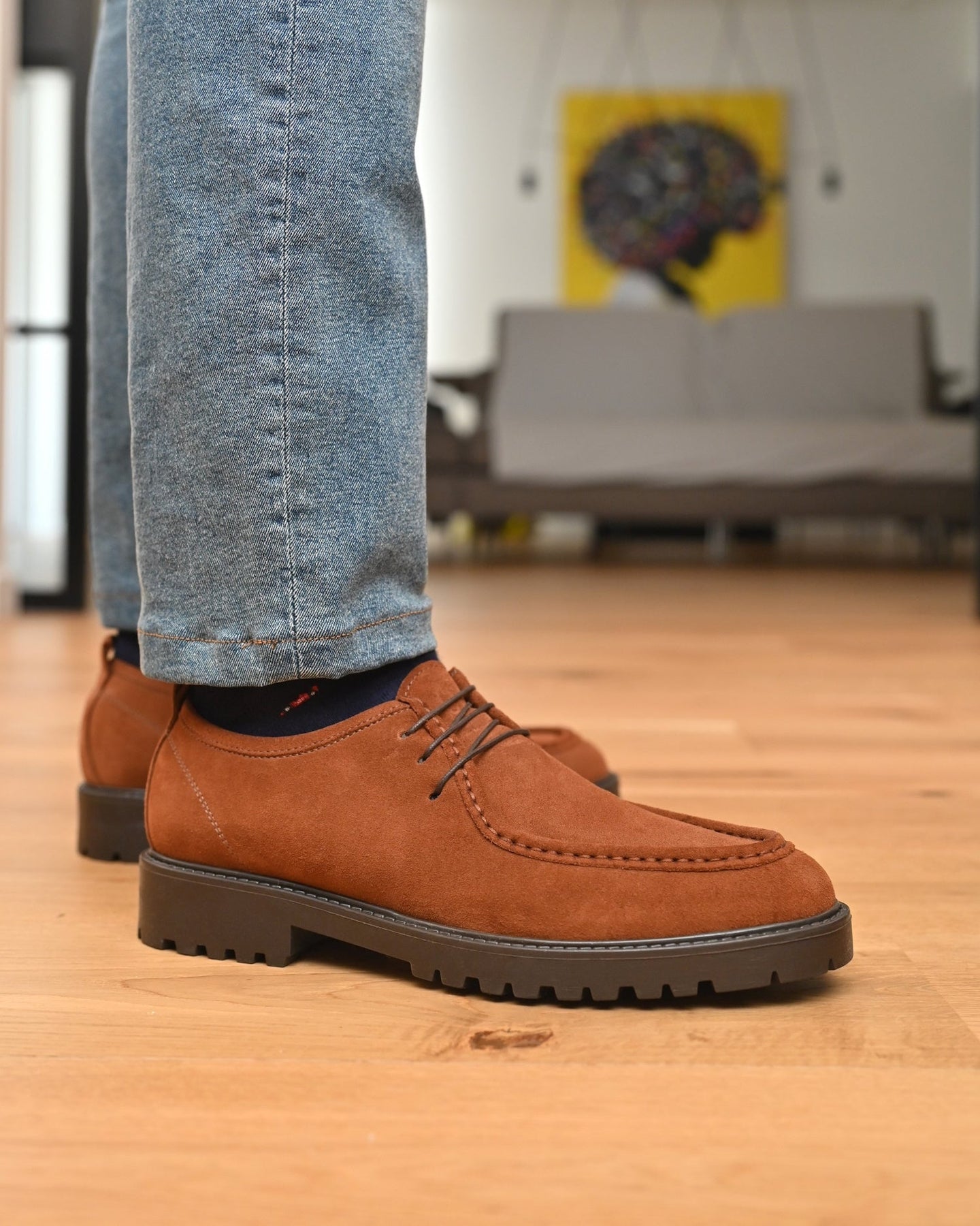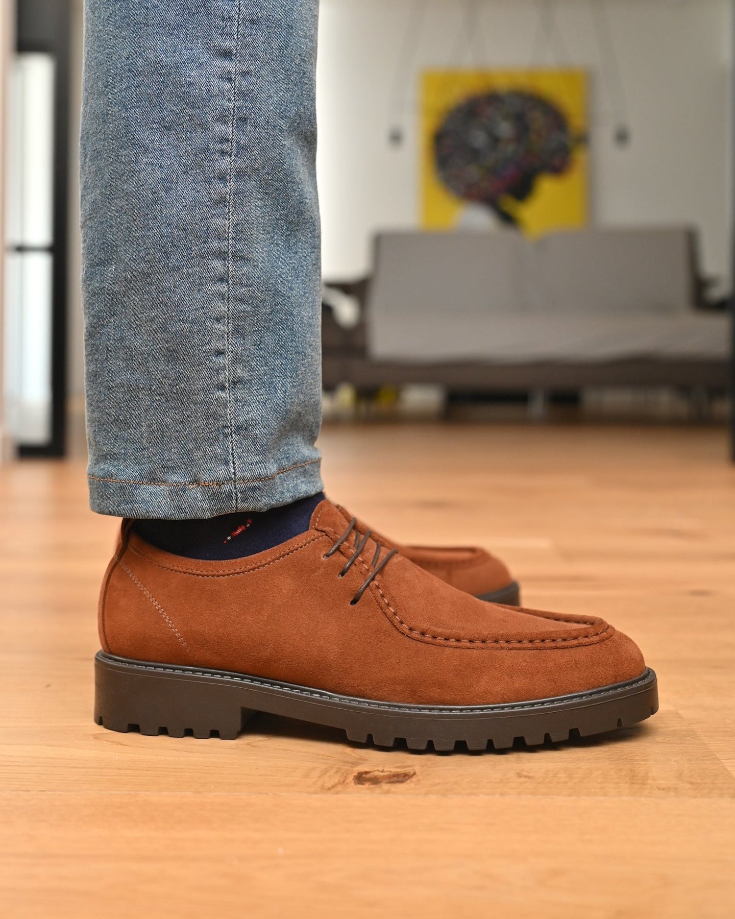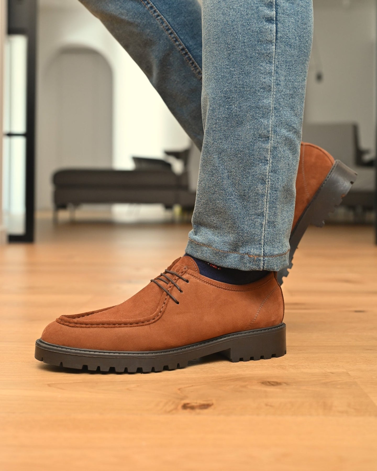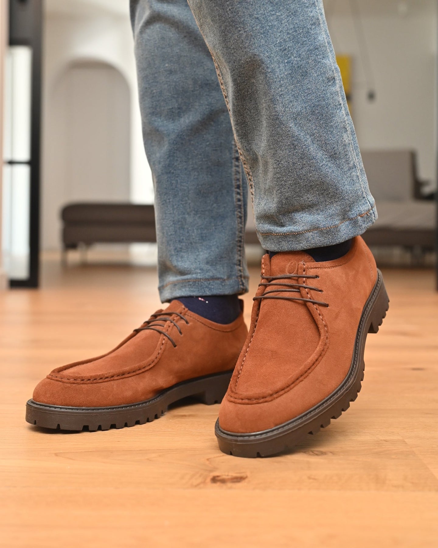 - Tomaia esterna: Vera pelle Italiana Scamosciata color marrone tabacco