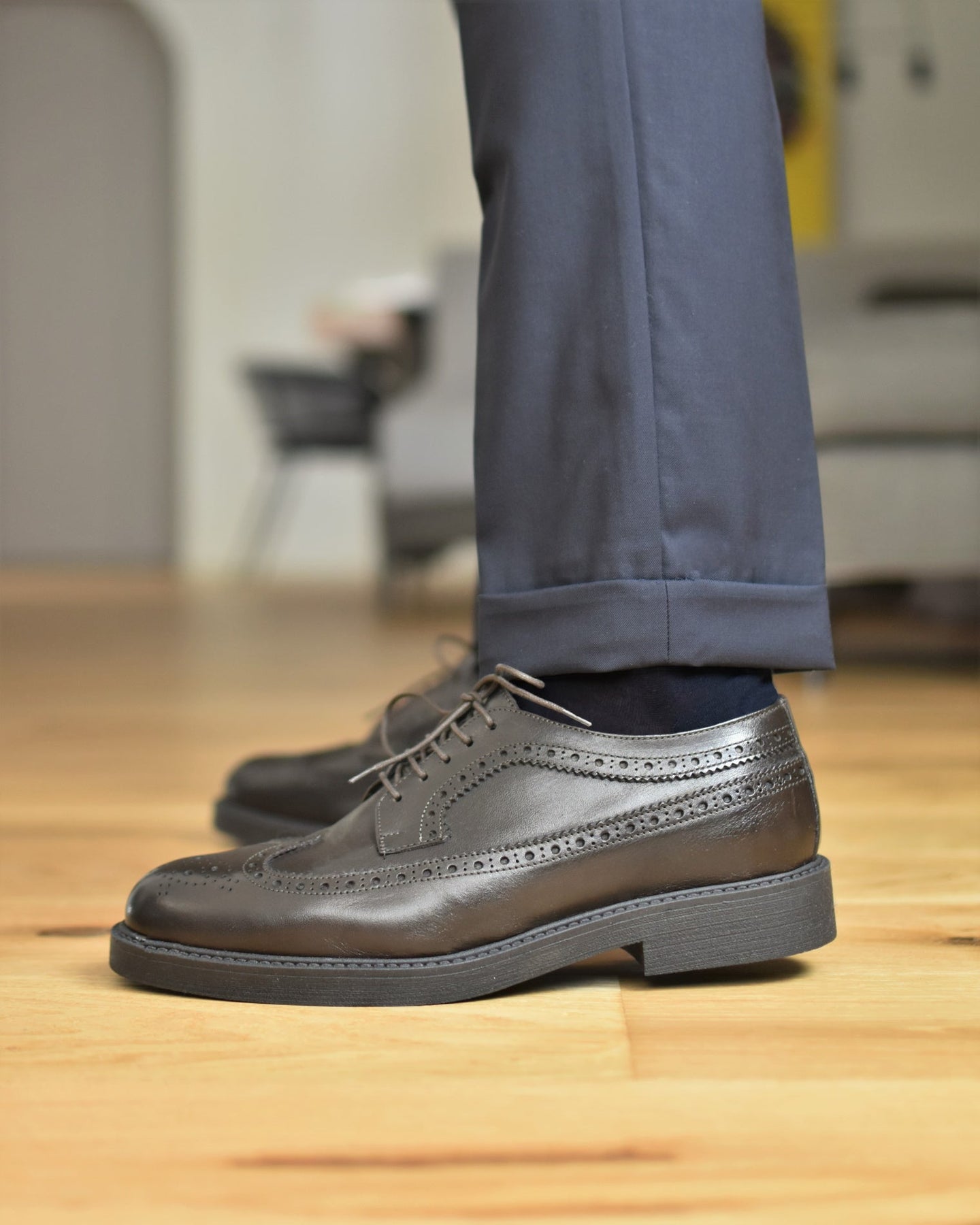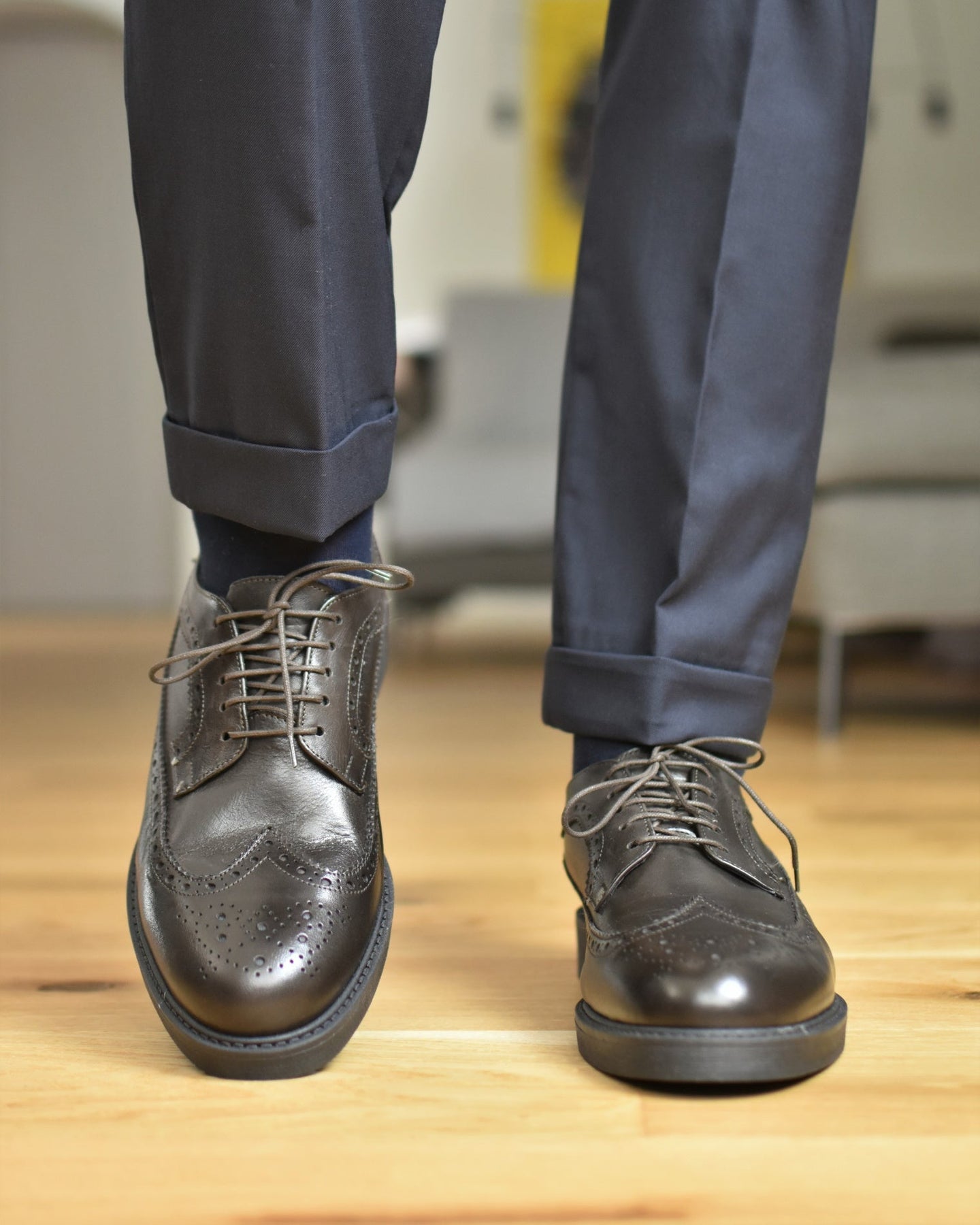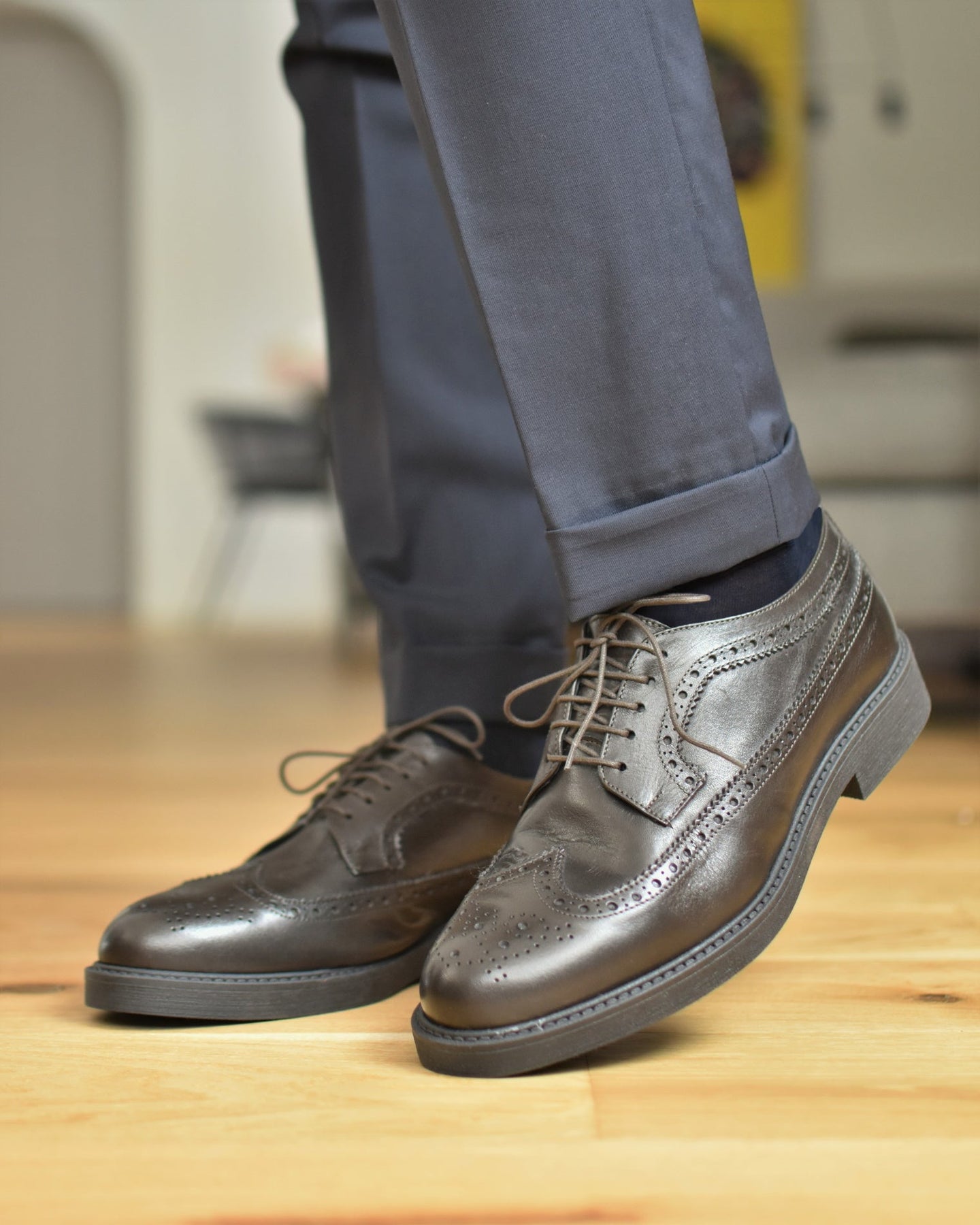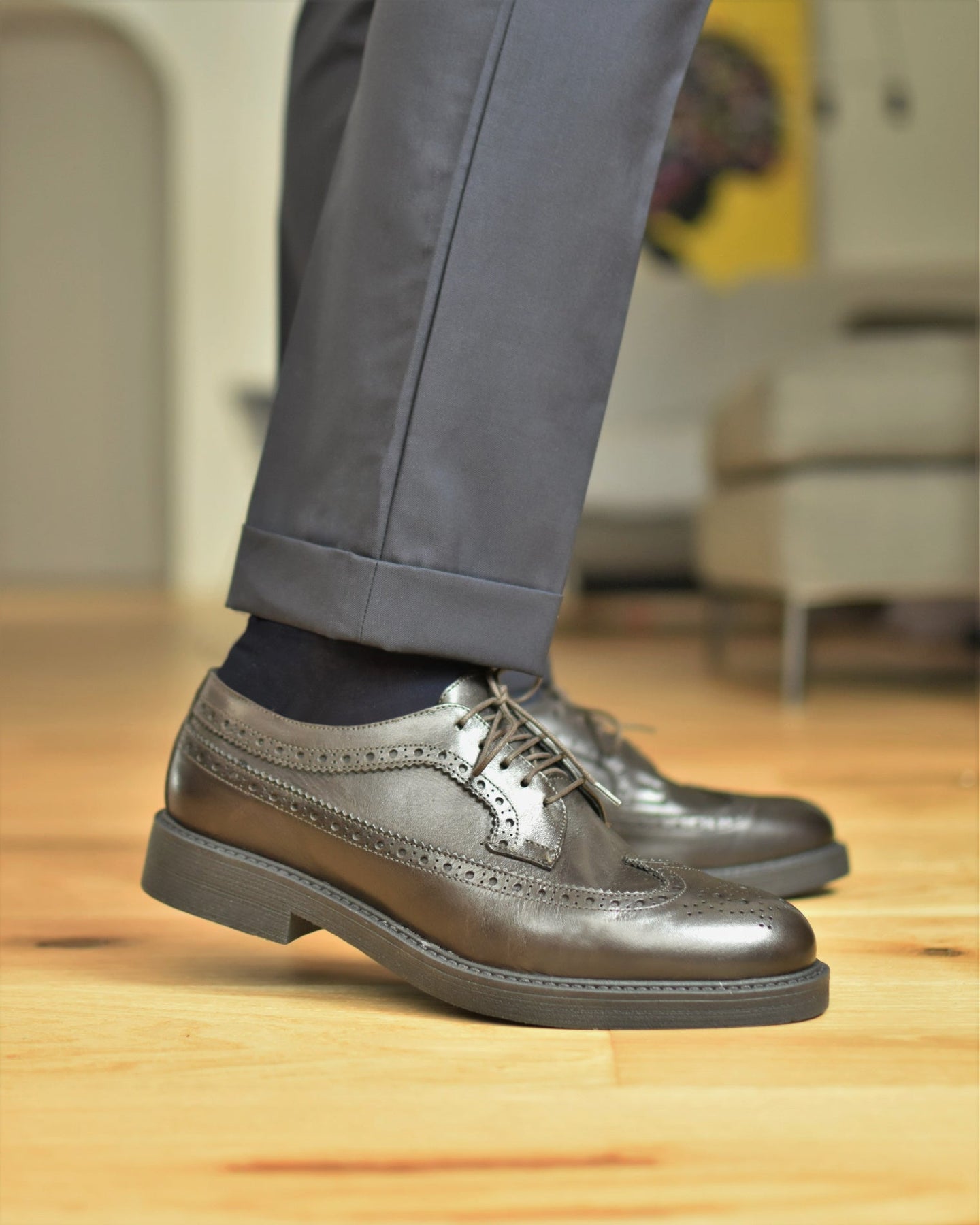 E' una stringata Derby dal gusto classico che grazie alla suola in gomma sintetica, fatta totalmente in Italia, assume un tocco di modernità e acquista anche tanta ma tanta comodità.