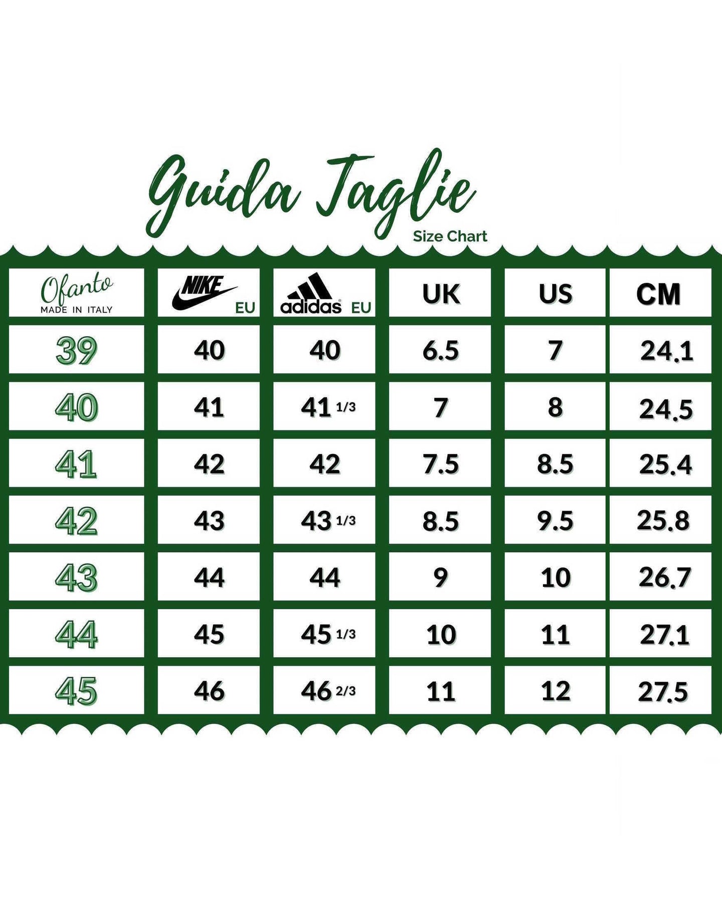 Ogni pagina prodotto include una guida alle taglie. In caso di dubbio, consigliamo di scegliere la taglia più grande.